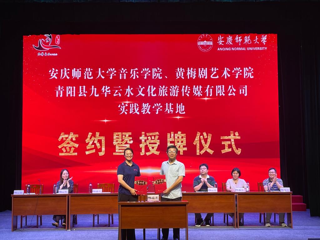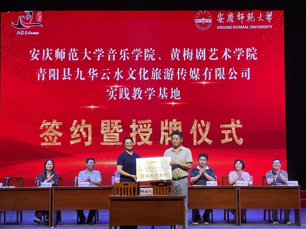 8月18日下午, 我院、黄梅剧艺术学院与青阳县九华云水文化旅游传媒有限公司在青阳腔博物馆小剧场隆重举行了实践教学基地签约暨授牌仪式。我院党委书记张铭、黄梅剧艺术学院党总支书记汪博武、我院副院长徐冉、副院长高艳,青阳县文旅局党组副书记罗桂珍、副局长杨荫武参加了此次签约暨授牌仪式。