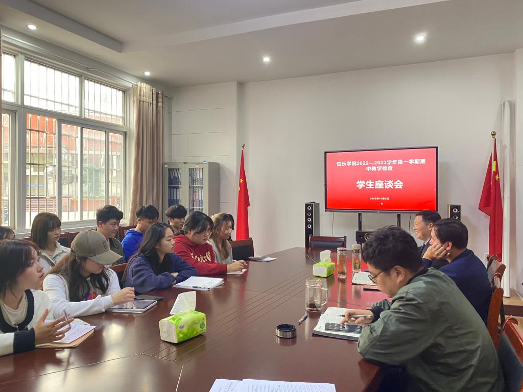 2022年11月3日下午,太阳集团tyc97282022-2023学年第一学期期中教学检查学生座谈会在艺术楼一楼会议室召开。学院党委副书记肖之进、副院长徐冉、副院长彭传山、教师代表王光丽以及20级、21级、22级学生代表参加座谈会,会议由副院长彭传山主持。