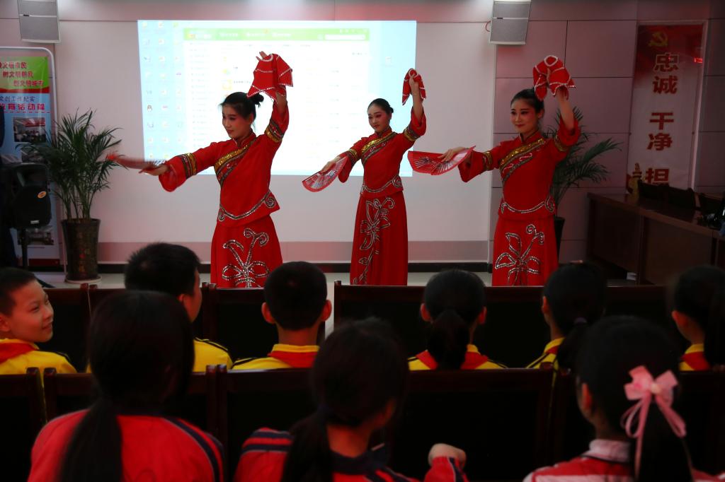 当然,孩子们也精心准备了节目。佩戴着红领巾的小学生们整齐地站成两排,轻轻踮起脚尖,摇摆着手臂,伴随着动听的音乐,他们的“曳步舞”开始了。一个个摇头晃脑,有模有样,赢得大家的阵阵掌声。
