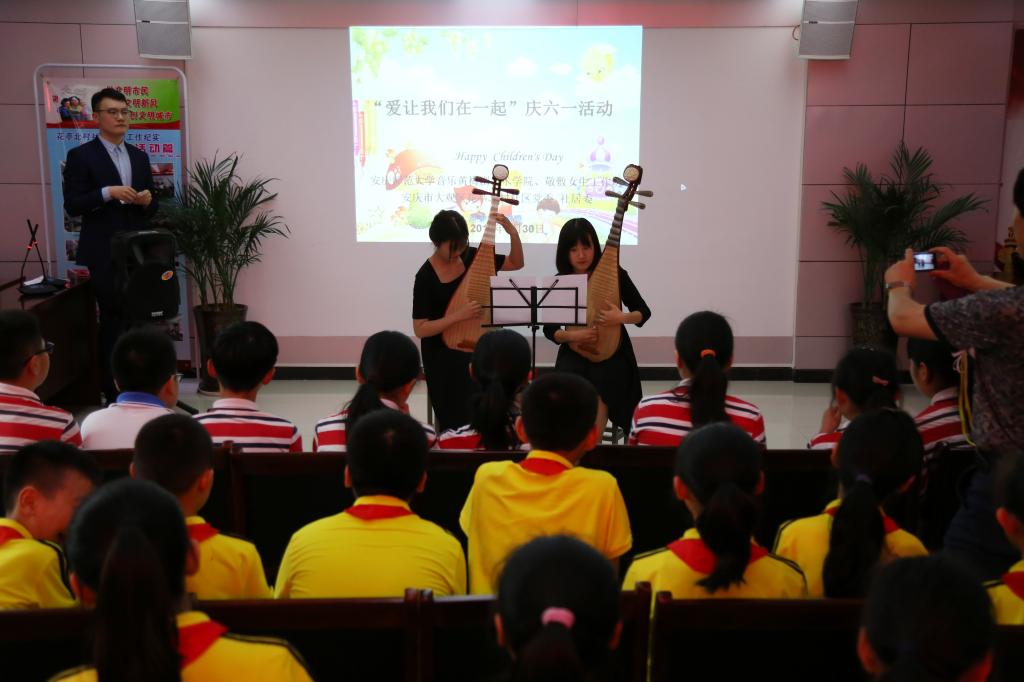 “我听见雨滴落在轻轻草地,我听见远方下课钟声响起……”5月30日下午,安庆市大观区高花亭社居委未成年人学校里乐声悠扬掌声阵阵,由音乐黄梅剧艺术学院与安徽省辅导员名师工作室敬敷女生工作坊组织的20余名志愿者走进该社区居委会,正在和那里的孩子们一起开展“爱让我们在一起”主题庆六一活动。