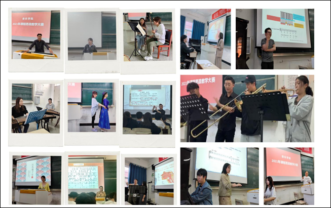 本次课程思政教学大赛,来自声乐、器乐、理论三个教研室的十四名教师分别从各自的专业和教授的学科特色出发,就推动高校思政课从“课内教”向“课外延”,拓展思政课空间,开阔大学生视野,塑造学生的品格,从而在音乐教学中增强学生的自豪感、纪律感等方面展开了精彩的教学演示。在器乐教学中,器乐老师们不仅专注于乐器本身的演奏技法,更从文化背景切入去解读乐曲的深刻内涵,带领着学生们重温爱国主义的旋律,引导学生树立正确的历史观。在声乐教学中,声乐老师们非常注重学生们对相应歌唱技巧的掌握,并结合“四史学习”,提高学生对于歌曲的思想认识,做到与历史故事的共情。理论课老师们则从民族文化背景切入,将“红色文化”的传承与发展融入舞蹈课堂的教学工作。整个教学比赛过程,参赛教师注重发挥学生主动性与教师适时的点评相结合;注重用音乐培养学生的爱国主义情感,增强集体主义精神;注重培养学生的感恩之心、民族文化自信心和民族自豪感,充分展现了音乐课堂在思政教学中的独特作用。