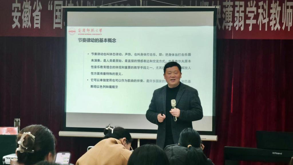 2023年2月10日,2022年安徽省“国培计划”农村紧缺薄弱学科教师短期集中培训项目——艺术(音乐)系列讲座第八场《节奏律动训练及在中小学中的运用》分别在小学音乐班和中学音乐班举行,由太阳集团tyc9728副院长彭传山主讲。