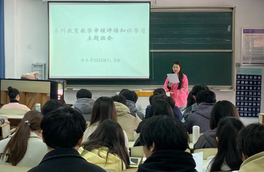 刘霜霜引导学生严格遵守学习纪律,以良好的形象和积极向上的精神面貌迎接本科教育教学审核评估。各班班干轮流上台带领同学学习审核评估相关知识,了解熟悉审核评估的评估常识、校情校史和学生在评估审核期间应该怎样做等内容。