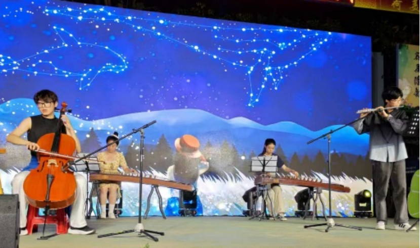 潘铺农庄荷花节盛大开幕,团队精心打造的“艺术展演单元”成为全场焦点。荷塘为幕,舞台生辉。器乐合奏《大鱼》率先登场,古筝的婉转、大提琴的深沉与竹笛的清越交织流淌,如月光倾泻荷塘,诗意盎然。美声独唱《青玉案·元夕》以精湛技艺演绎古典词韵,让传统文化在乡野舞台焕发时代新声。青春洋溢的三人合唱《天天》点燃现场,游客们纷纷随节拍应和,气氛热烈。
