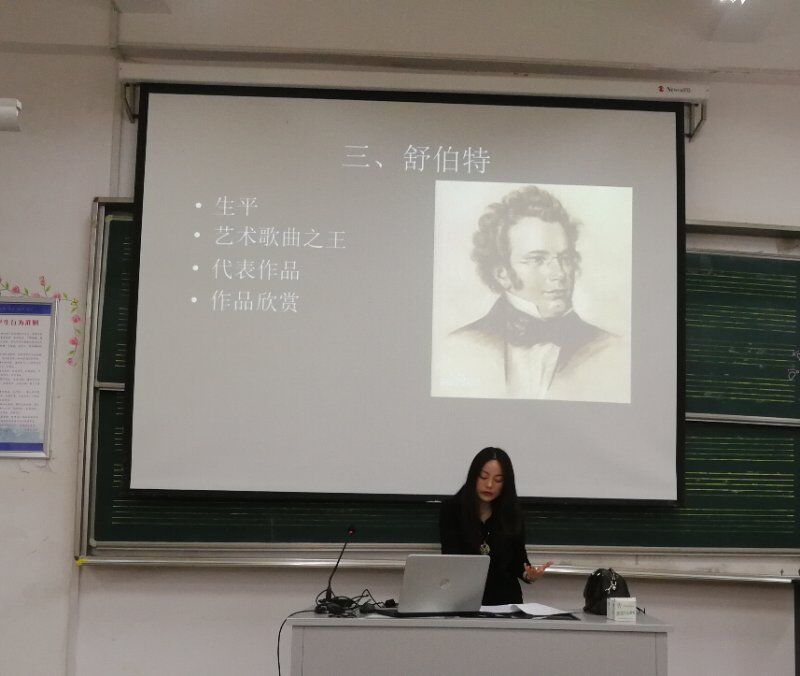 高艳副教授用一首大家比较熟悉的歌曲《摇篮曲》引入了讲座的主题。从艺术歌曲产生的历史背景、艺术歌曲的风格特点、代表人物等方面进行了展开,重点介绍了“艺术歌曲之王”舒伯特的创作之路和代表作品。强调了舒伯特在艺术歌曲的创造中充分发挥钢琴的艺术表现力,把歌曲的词、曲、伴奏三者有机的结合,诗意和情景自然的交融,大大的增加了歌曲的表现力。