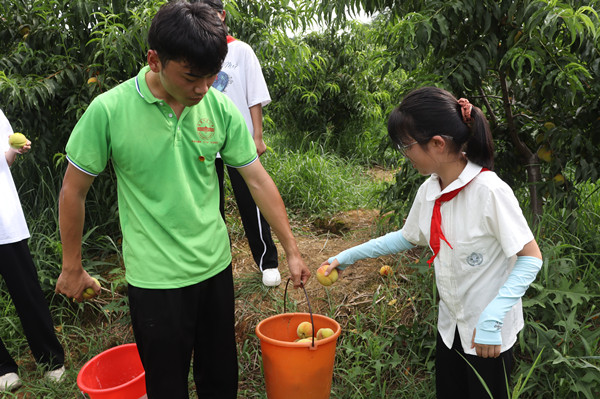 嫁接育苗,垄上种树,沟间排水……“小老师”们带领30余名学生步行15分钟,走进黄桃林,跟随桃园果农的步伐,学习种植黄桃的方法,观赏成熟黄桃饱满的形态,了解桃树“三年结果”的特性。移步换景,随着学生们的脚印留在黄土泥地上,不到半小时,“小老师”手中的桶就盛满了个头硕大的黄桃。