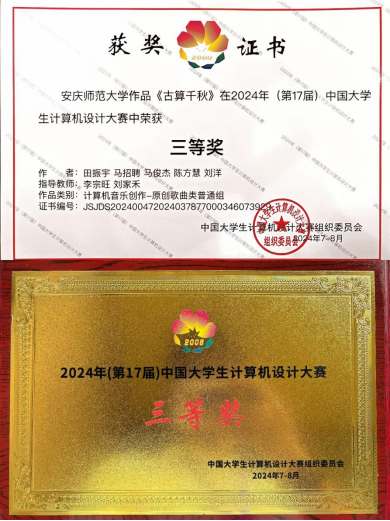 2024年8月18日-22日,第17届中国大学生计算机设计大赛“信息可视化设计”和“计算机音乐创作”两个作品类别的国赛决赛在浙江师范大学(金华校区)举行。我院团队携带原创歌曲作品《古算千秋》参赛。团队成员凭借扎实的音乐功底、新颖的创作理念和精湛的技艺,在比赛中表现出色,荣获本次比赛全国三等奖。