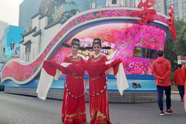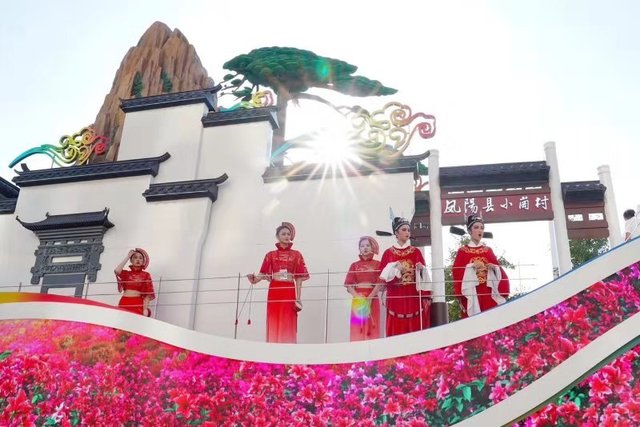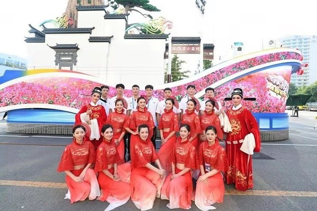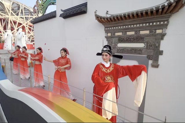 当盛装亮相的“美好安徽”彩车缓缓驶过天安门广场,彩车中部马头墙的两侧分别站着一位“女驸马”。她们帽插宫花,身着红袍,挥舞水袖,唱起清丽婉转的黄梅戏,向全国人民展示徽风皖韵。而这两位女驸马的扮演者均来自9728太阳集团。
